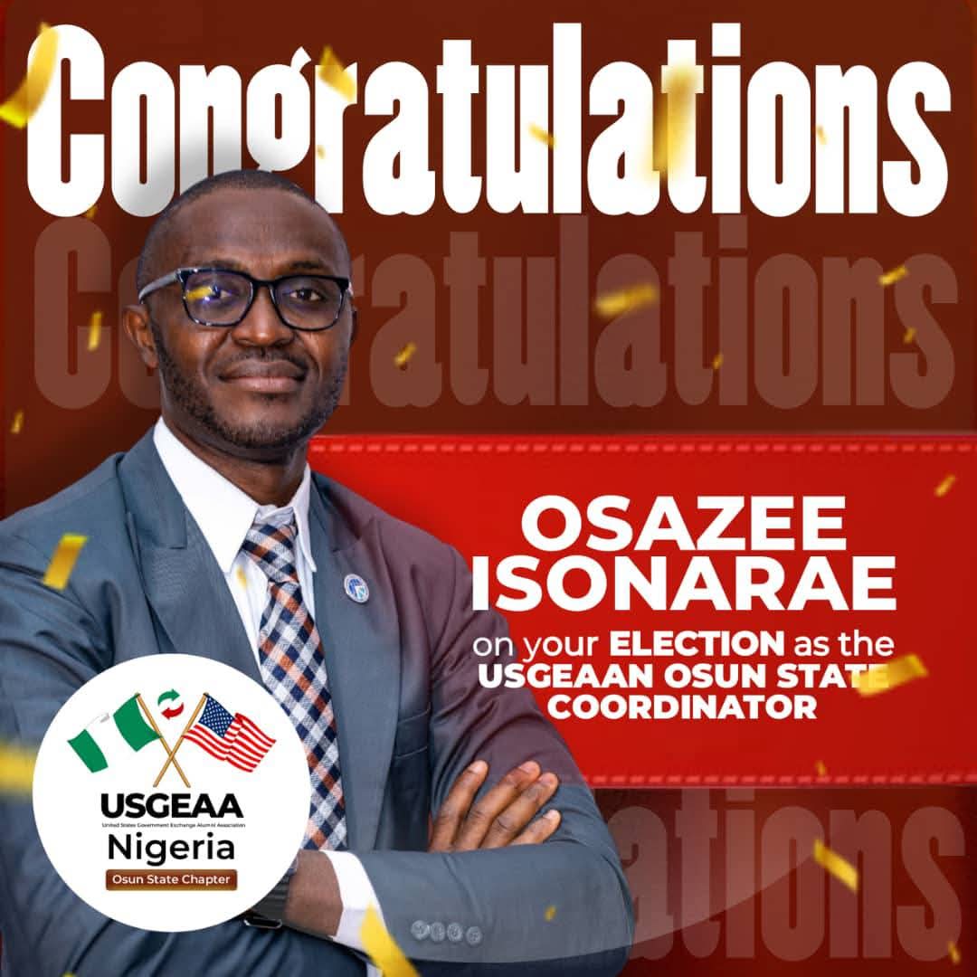 We are pleased to announce that Osazee Isonarae has emerged as the newly elected State Coordinator of the U.S. Government Exchange Alumni Association of Nigeria (USGEAAN) Osun State Chapter, succeeding Dr. Femi Adefila Chairman of Rave Fm 91.7/WSTV, who has ably led the chapter in recent years.